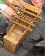 The kindergarteners were presented with an Orff xylophone with only four tone bars [left] chosen from the pentatonic scale [see sidebar]. On each tone bar, we placed one each of a green, red, yellow and blue sticker. These would become the names of the notes. The students were split into three groups and sent to a xylophone. An adult at each xylophone facilitated the creation of a short phrase that each student played on the instrument while the other members sang along. Repeating this phrase made a song that was easily remembered by each creator.