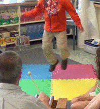 Once all of the students in a group had created, played and sung a song, we introduced 4-colour foam mats [right]. The students were invited to dance to each others’ songs hopping from colour to colour as indicated by their songs. The creator played the xylophone, one volunteer danced, and the rest of the group sang along.