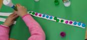 The students were guided to create a record of their songs using long strips of chart grid paper and different coloured bingo dabbers. [above & left] These were to become the basis of a work of visual art that reinforced the concept of a pattern core.