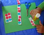 With the records of their music firmly in hand, the students shared their songs and dances. The idea that we can record and reproduce patterns of music and dance came easily to the students. Next we asked them to use these strips of patterns to create a work of art [left]. The students cut apart their patterns at the pattern core. These parts were then glued to construction paper in a way that reinforced further the idea that the ‘repeating part’ was the core of their pattern.