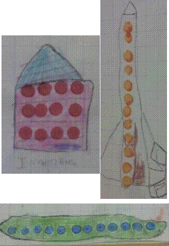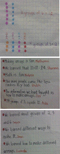 As a consolidation to help the students remember what they had learned, they were asked to make their arrays into pictures of other things. From the imagination of the students came arrays ‘dressed up’ as rocket ships, caterpillars, and houses. This served the students as a focal point for the memorable mathematical learning experience they had had. To make the experience even more memorable, comments the students had made in class during their learning as well as comments they had made during their class summaries were put together to make lyrics for a song. The strength of making lyrics up from the words of the students is that they can now all hear their own words - it is themselves singing about mathematics. The song was recorded and made into a video with pictures of them during the learning time. This video was posted to the Mathfest.ca website so that it might reach a larger audience and so that students could share their learning at home with their parents.