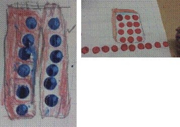 The students were mathematical explorers and storytellers. As we shared the story with them, they modeled different ways to show how the cookies could be shared. Working in pairs, they represented each problem by re-arranging their linking cubes to match the dilemma the children in the story faced. After having gone through the entire story and having modeled each case of cookie sharing, the students were given bingo dabbers and grid chart paper to explore different ways to make twelve. They had no difficulty making different arrays of twelve.