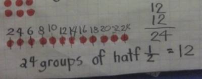 As elementary teachers, we are very good at modeling numbers and mathematical situations with manipulatives before having students work in the abstract with numbers. In this instance we added a step in between the concrete and the abstract: the representation. Being able to represent numbers and concepts in pictorial form is a powerful bridge between the concrete and the abstract that we will have to try to implement more often. The student who very easily showed how 12 ÷ 24 = ½ was able to simply prove her thinking using a bingo dabber array and a marker to divide each ‘cookie’ in half. There would have been no elegant way for her to have accomplished this with linking cubes.