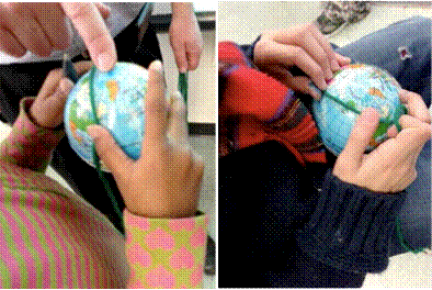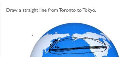 The students were asked to draw a line on a map they thought would be the straightest, shortest line between Toronto and Tokyo. Next they were given a piece of string and asked to trace their paths on the globes.
