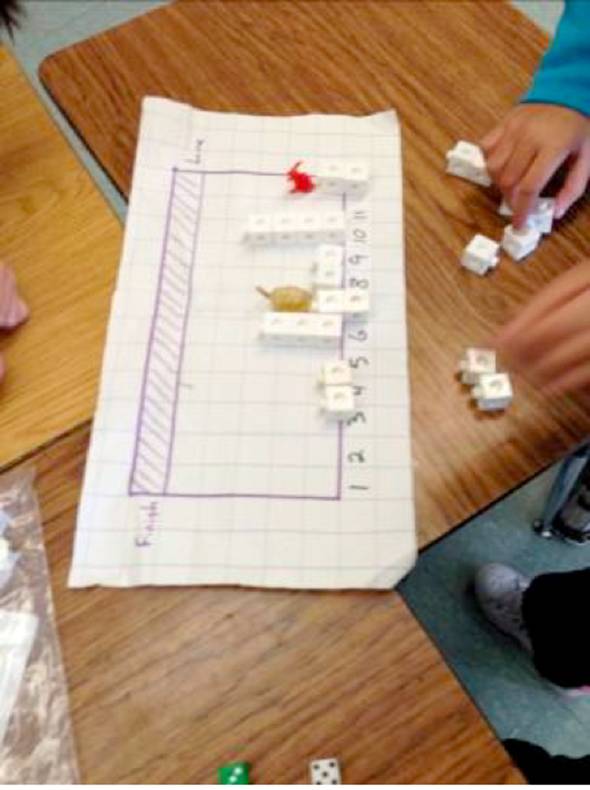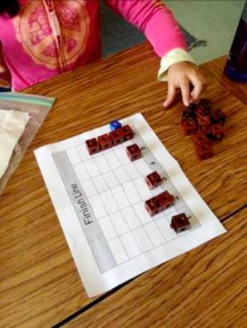 The students experienced the mathematics of probability through a story about the rematch between Tortoise and Hare. We followed the associated lesson plan which starts by looking at a completely random effect. The students had a number cube race with one number cube. “Each of you pick a number. The first to the finish line wins.” This reinforced what the students already believed: that rolling a number cube is random, you cannot really predict the outcome. This was to serve as a discrepant event as the students went on to experience events that were not so random. The use of discrepant events helps to focus the students’ thinking as they try to reconcile the reasons behind them.
